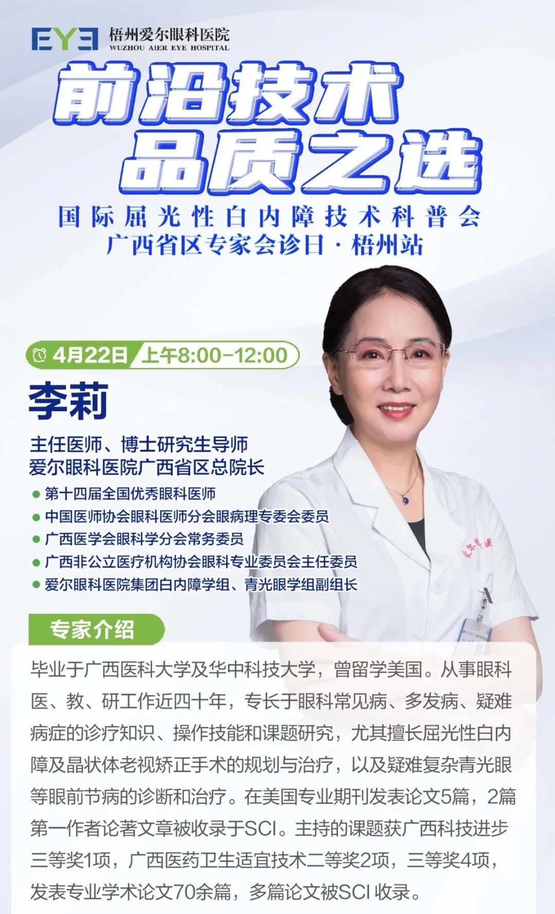 为进一步推进健康梧州建设,宣传普及中老年眼健康知识,方便梧州市老百姓足不出市就能享受专家会诊,不用出远门就能挂上专家号,4月22日上午,梧州爱尔眼科医院在五楼大会议室开展“前沿技术·品质之选”国际屈光性白内障技术科普会暨爱尔眼科广西省区总院长李莉会诊·梧州站活动。活动特邀爱尔眼科广西省区总院长李莉会诊。
