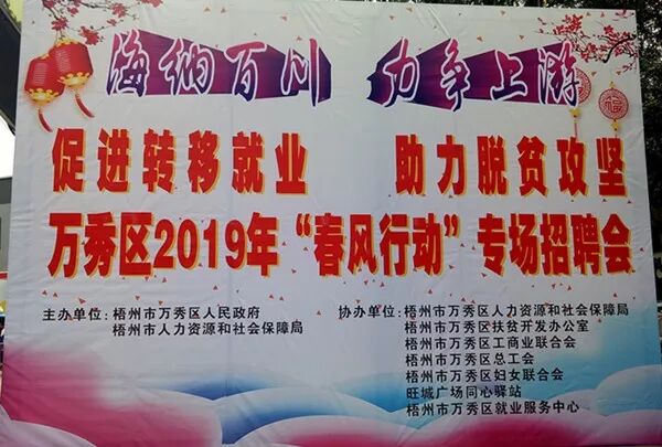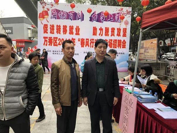 为促进转移就业,助力脱贫攻坚。2月15日上午,由梧州市万秀区人民政府、梧州市人力资源和社会保障局主办,万秀区人力资源和社会保障局、扶贫开发办公室、工商业联合会、总工会、妇女联合会联合承办的万秀区2019年“春风行动”专场招聘会在旺城广场举办。