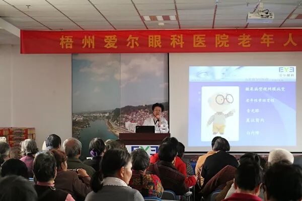 讲堂上,梧州爱尔眼科医院院长马丽华为老年人讲解了眼的生理结构以及日常生活中如何预防、治疗老年性眼病的相关知识。马院长表示,老年性眼病主要包括:糖尿病型视网膜病变,老年性黄斑变性,青光眼,翼状胬肉,白内障等。