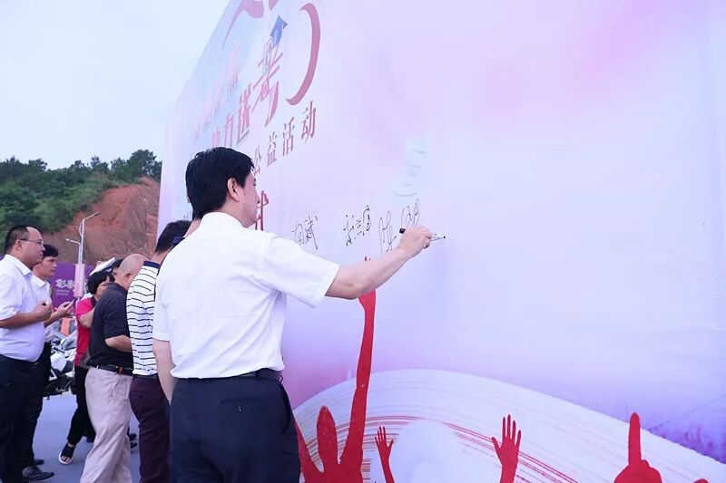 ▲领导、爱心司机等在主题背景板签名。
